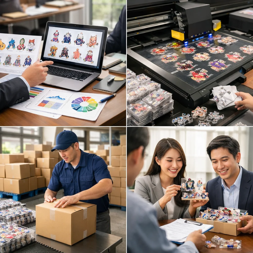アクリルグッズ大ロット注文の流れは、以下のステップで進行します。