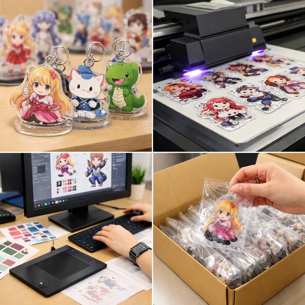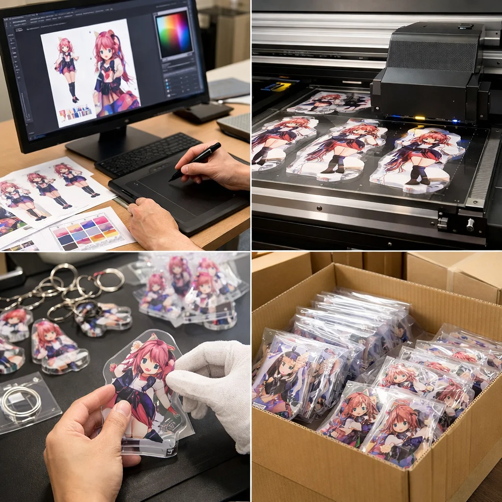 以上が、アクリルグッズ販売用制作から販売までの主な流れです。各ステップを丁寧に進めることで、品質の高いアクリルグッズ販売することが可能となります。初めての方でも、この流れを理解し、順を追って進めることで、スムーズにアクリルグッズ販売用制作を行うことができます。