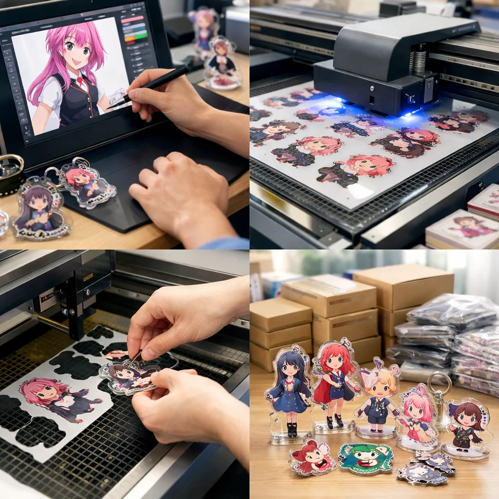 入稿されたデータを基に、アクリルグッズ製造が始まります。一般的なアクリルグッズ製造工程は以下の通りです: