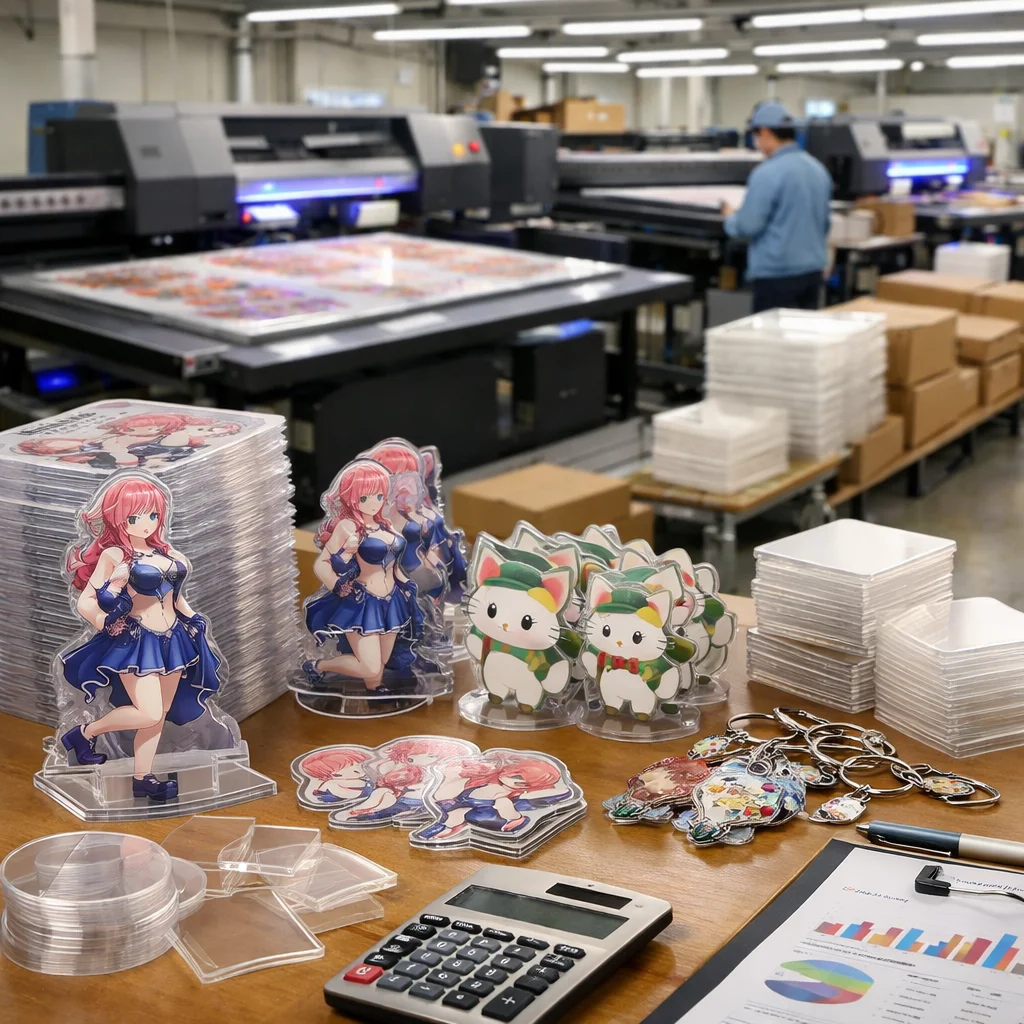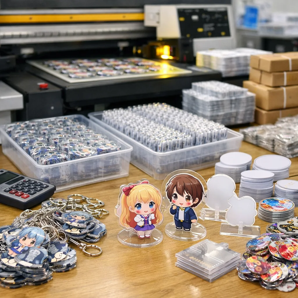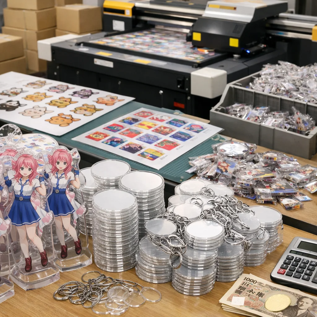 アクリルグッズの価格は、サイズ、厚み、印刷方式等多くの要素によって決まります。これらの理解により、量産時のコストを効率的に管理できるでしょう。