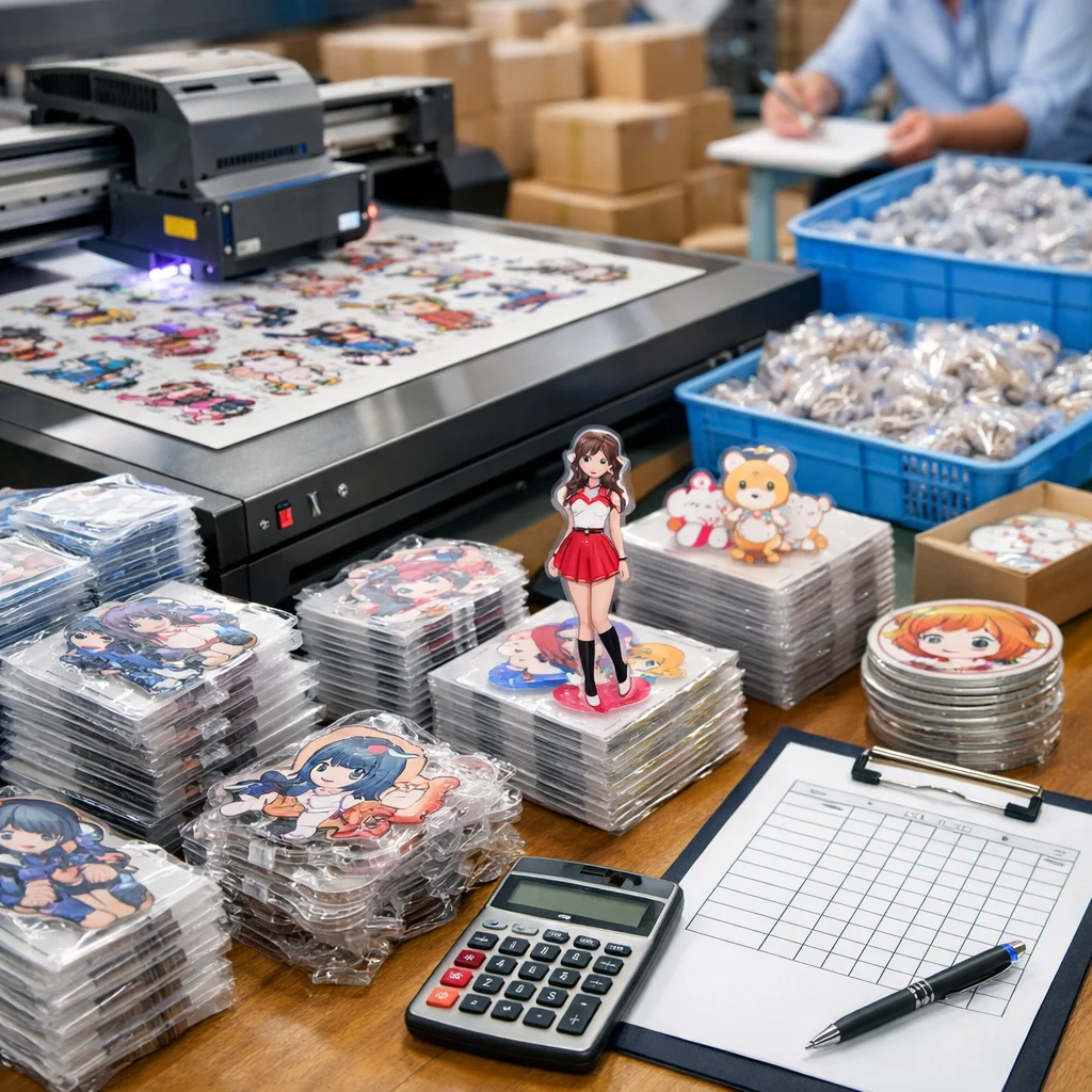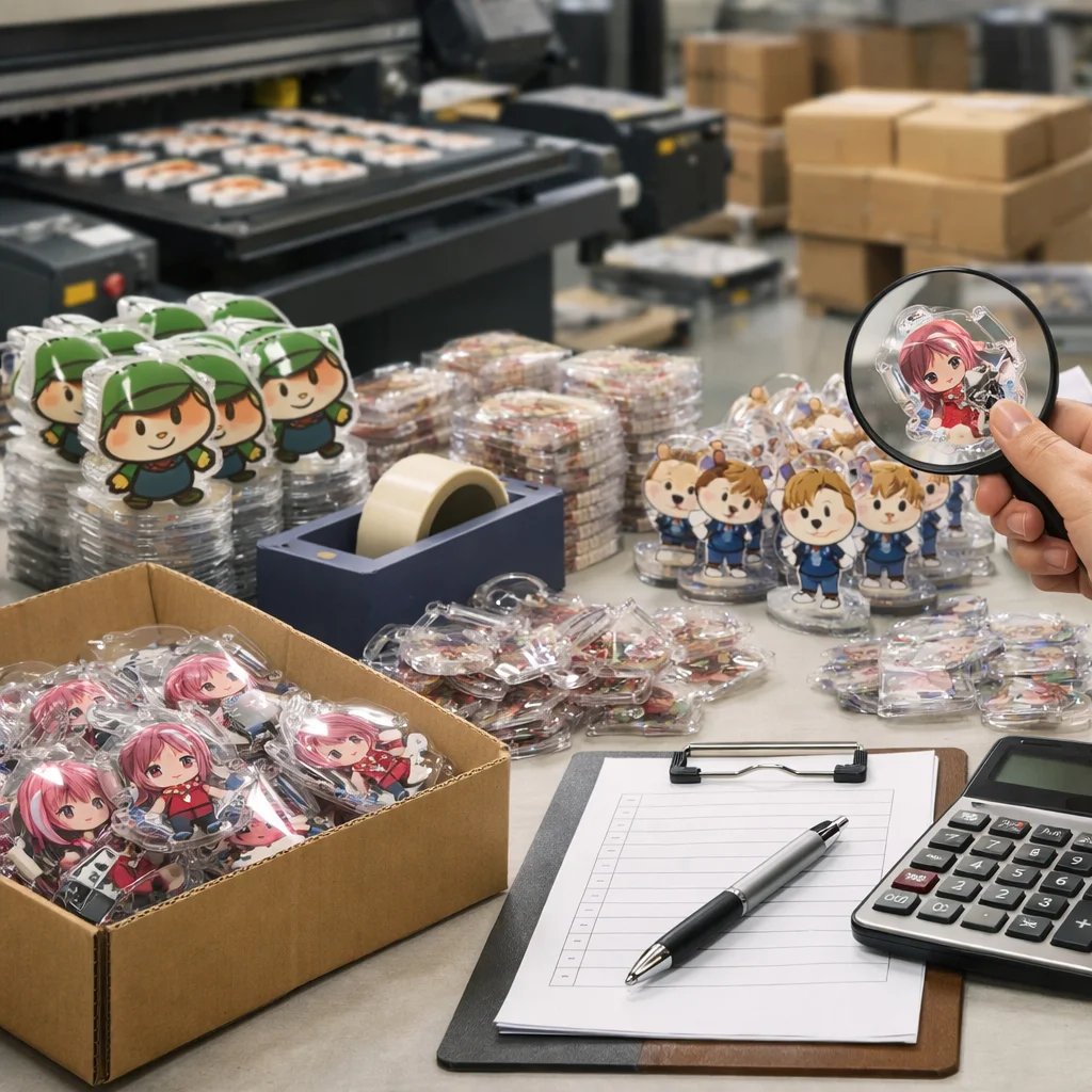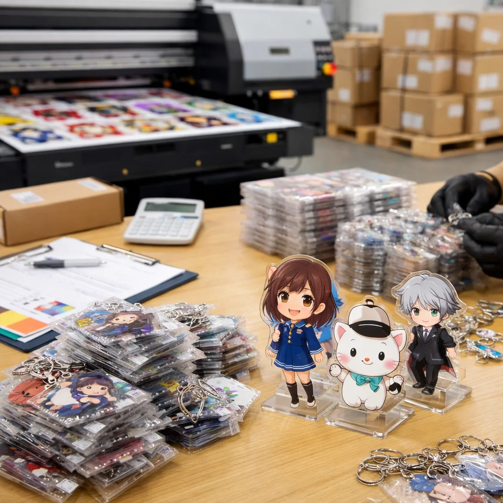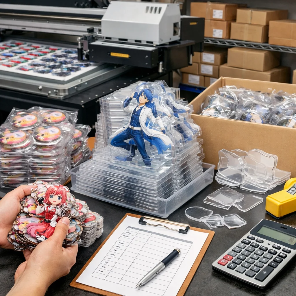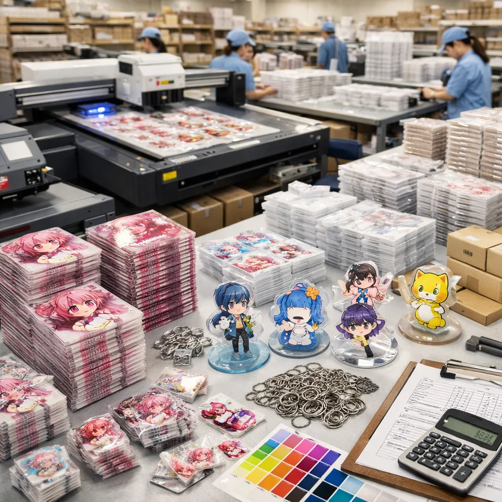 アクリルグッズの大ロット注文では、コストは「単価×数量」だけでなく、版代、加工費、梱包費、検品、送料など多くの要素を含むことに注意が必要です。総コスト(TCO)を正確に把握することで、業者選定や品質管理が効果的に行え、結果的にコスト削減につながります。