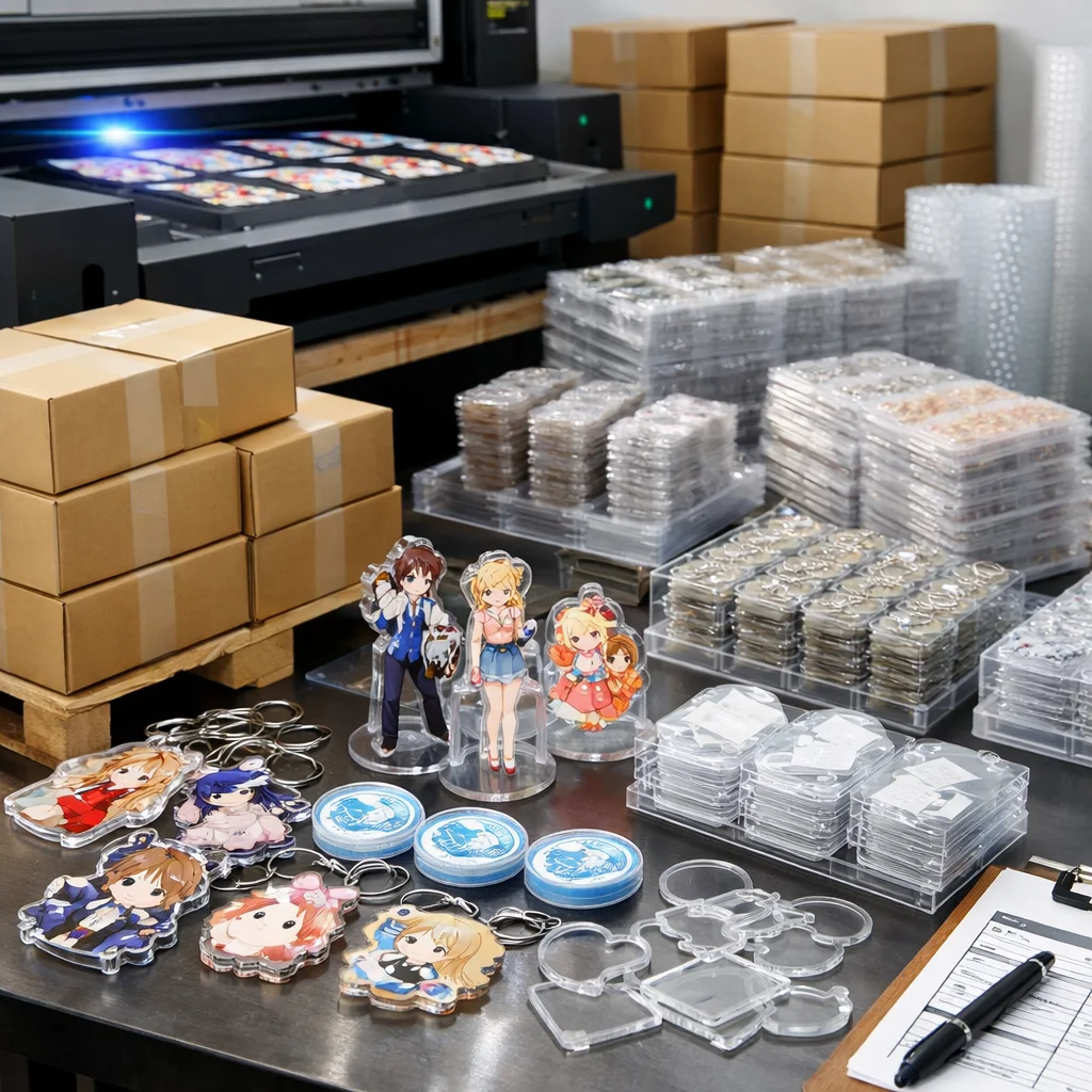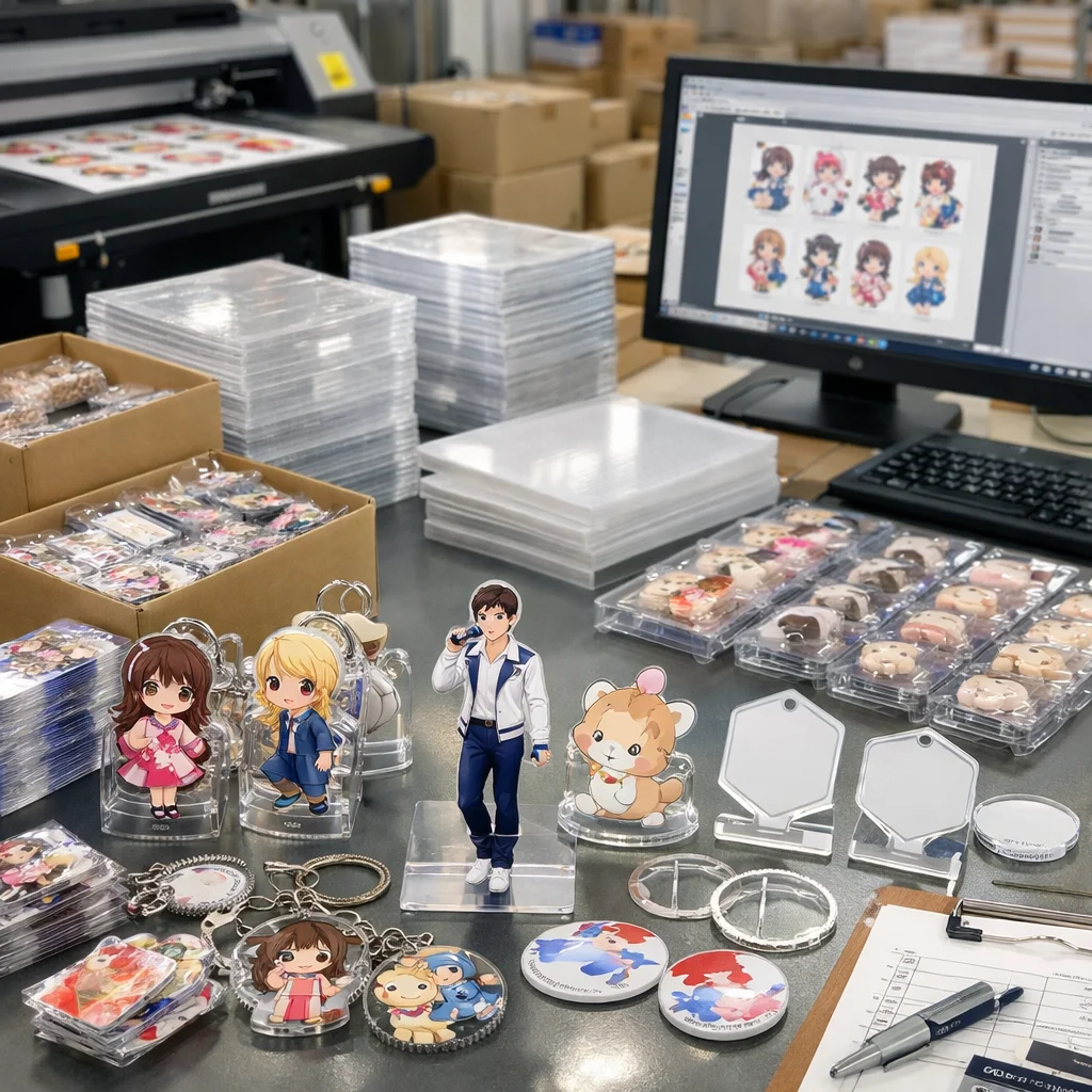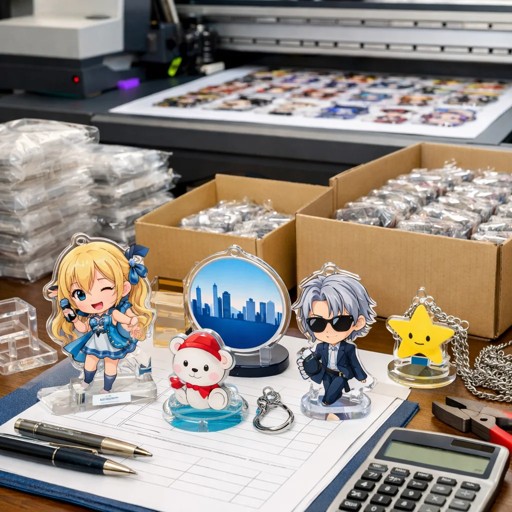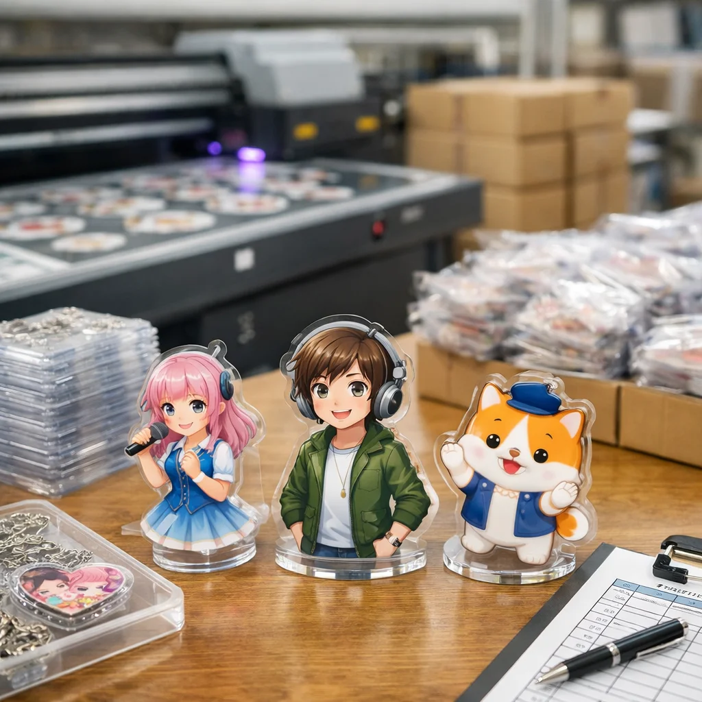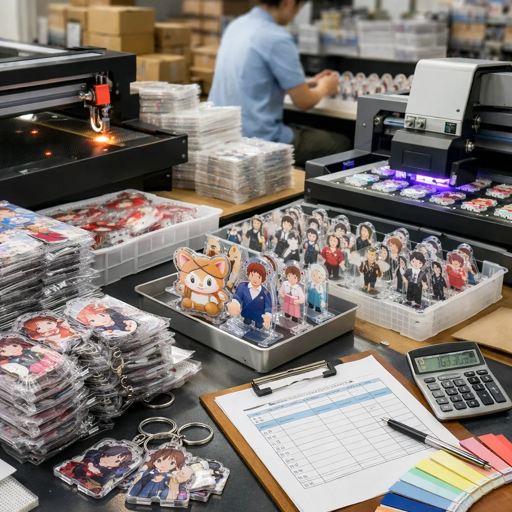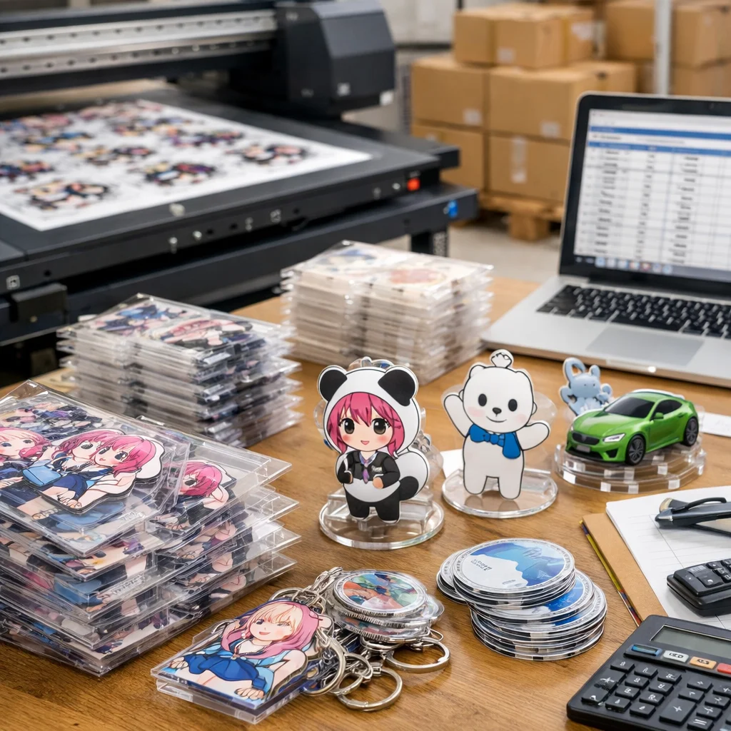 アクリルグッズの大ロット注文では、コストは「単価×数量」だけでなく、版代、加工費、梱包費、検品、送料など多くの要素を含むことに注意が必要です。総コスト(TCO)を正確に把握することで、業者選定や品質管理が効果的に行え、結果的にコスト削減につながります。