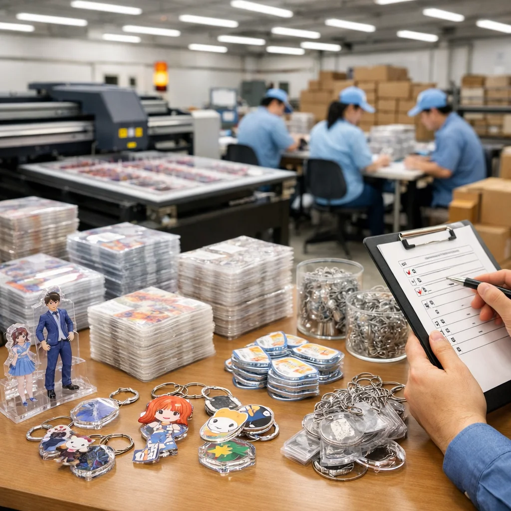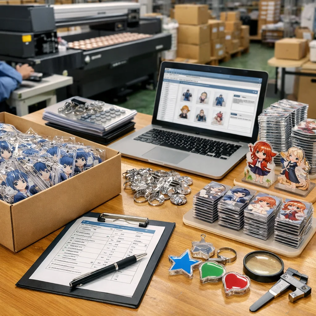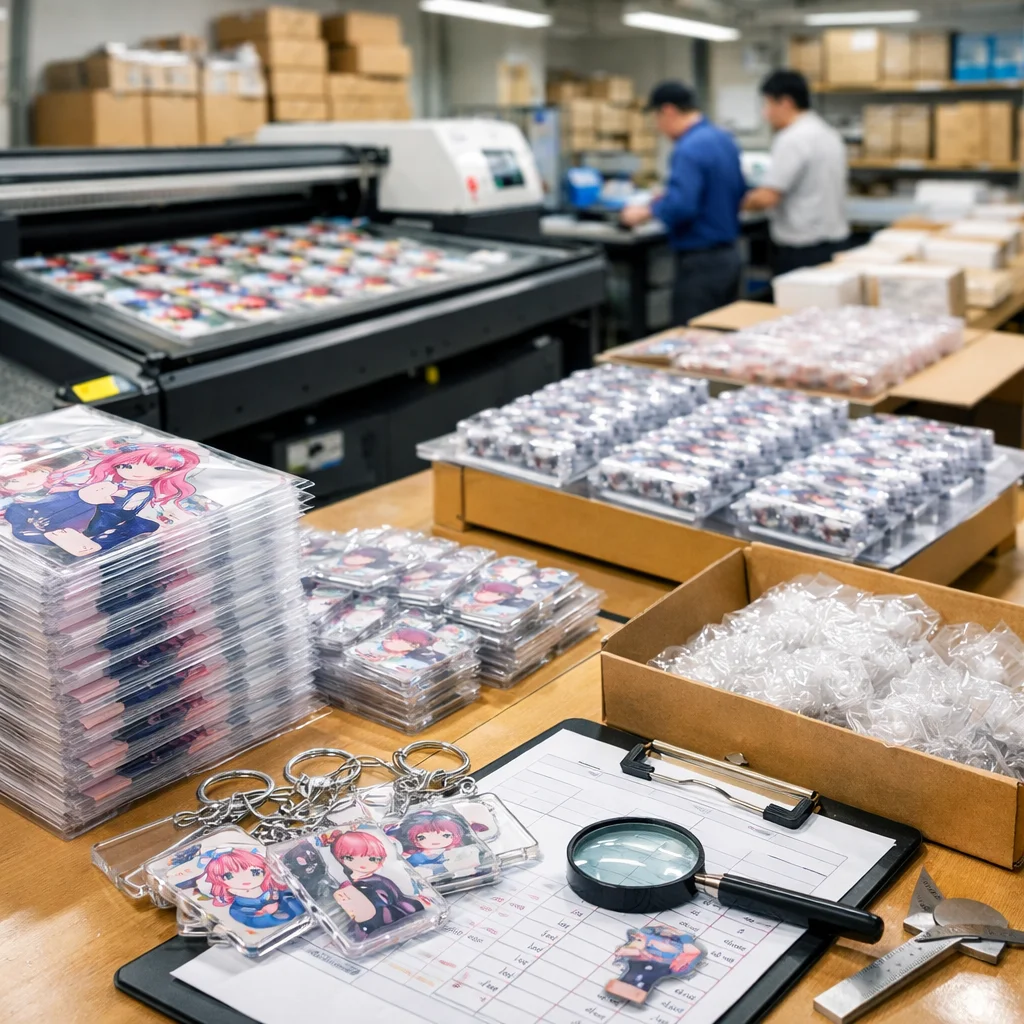 よくあるトラブルとその解決策![]() アクリルグッズの大ロット注文において、よく発生するトラブルとその解決策を事例ベースでご紹介します。これらの注意点を理解し、適切な対応を行うことで、スムーズな取引が可能となります。 1. 印刷ズレ – 原因候補: データの配置ミスや印刷機の調整不良。 – 一次対応: 該当ロットの製品を一時的に使用中止とし、印刷データと機器設定を再確認。 – 再発防止: 印刷前のデータ確認プロセスを強化し、機器の定期的なメンテナンスを実施。 – 業者に伝えるべき情報: 問題の発生したロット番号、該当製品の数量、印刷データのバージョン、印刷機の設定情報。 2. 色味違い – 原因候補: モニターと印刷物の色差、インクの品質問題。 – 一次対応: 問題のある製品を隔離し、色見本と照らし合わせて確認。 – 再発防止: 印刷前の色校正を徹底し、インクの品質管理を強化。 – 業者に伝えるべき情報: 色見本の写真、該当ロットの製品番号、色味の具体的な差異の説明。 3. 傷・汚れ – 原因候補: 製造工程での取り扱い不良、梱包時の不注意。 – 一次対応: 問題のある製品を隔離し、製造・梱包工程を再確認。 – 再発防止: 作業員への教育を強化し、品質チェックリストを導入。 – 業者に伝えるべき情報: 問題のある製品の写真、該当ロットの製品番号、発生箇所の詳細。 4. パーツ不足 – 原因候補: 部品の発注ミス、在庫管理の不備。 – 一次対応: 不足しているパーツの発注を急ぎ、納期の調整を行う。 – 再発防止: 在庫管理システムの見直しと、発注プロセスの標準化。 – 業者に伝えるべき情報: 不足しているパーツの型番、数量、該当ロットの製品番号。 5. 梱包破損 – 原因候補: 梱包材の選定ミス、輸送中の衝撃。 – 一次対応: 破損した製品を確認し、梱包方法と輸送経路を再評価。 – 再発防止: 梱包材の見直しと、輸送業者との連携強化。 – 業者に伝えるべき情報: 破損した製品の写真、該当ロットの製品番号、梱包方法の詳細。 6. 納期遅延 – 原因候補: 生産工程の遅れ、物流の問題。 – 一次対応: 遅延の原因を特定し、関係者と連携して解決策を模索。 – 再発防止: 生産スケジュールの見直しと、物流パートナーとの連携強化。 – 業者に伝えるべき情報: 遅延の理由、影響を受けるロット番号、納期の再調整案。 7. データ差し戻し – 原因候補: データ形式の不一致、解像度不足。 – 一次対応: 差し戻されたデータを確認し、必要な修正を行う。 – 再発防止: データ入稿時のガイドラインを明確化し、事前確認を徹底。 – 業者に伝えるべき情報: 差し戻されたデータの内容、修正箇所、再入稿のスケジュール。 これらのトラブルは、アクリルグッズの大ロット注文時にしばしば発生します。事前の注意点として、発注前に製品仕様やデザインデータの確認を徹底し、信頼できる業者との連携を強化することが重要です。また、問題発生時には迅速かつ適切な対応を心掛け、再発防止策を講じることで、アクリルグッズの大ロット注文をスムーズに進めることができます。 発生しうる問題点、チェックリストで防ぐ![]() アクリルグッズの大ロット注文を成功させるためには、発生しうる問題点を事前にチェックリスト化しておくことが非常に重要です。具体的な注意点を伝えることで、トラブルを未然に防ぎ、スムーズな取引を確保できます。以下に挙げるチェックリストは、アクリルグッズの大ロット注文において注意すべき各ステップを明確に示しています。 まず、発注に関する仕様をしっかりと明文化することが大切です。製品のデザインや仕様が曖昧なままだと、業者との誤解が生じやすくなります。このため、発注書の段階でしっかりと確認を行いましょう。 次に、校正承認フローを設けることで、印刷や製造時のデータミスを防ぎます。校正を行うことで、色味やデザインのずれを未然に発見できるため、特に大ロットでは効果的です。 また、検品基準の合意も必要です。注文したアクリルグッズの数量が多ければ多いほど、製品の状態を確認する手間も増えるため、業者と共通の基準を設けておくことが重要です。これにより、受け取った商品の品質に対する期待値が一致し、問題が発生した際にもスムーズに対応が可能になります。 不良品の許容率や補償条件の合意も忘れずに行いましょう。特に大ロットの場合、製造過程での不良品は必ず発生するため、どの程度まで許容できるのかを事前に決めておくことが、トラブル回避につながります。これはアクリルグッズの品質管理において非常に大切なステップです。 さらに、予備数を取り入れることで、想定外のトラブルにもコーピングできる体制を築きます。特に、急な仕様変更や予想外の不良に備え、10%程度の予備数を発注することをおすすめします。 分納も一つの手段입니다。大ロットを一度に受け取るのではなく、数回に分けて納品してもらうことで、万一の不良品に早く気づくことができ、その