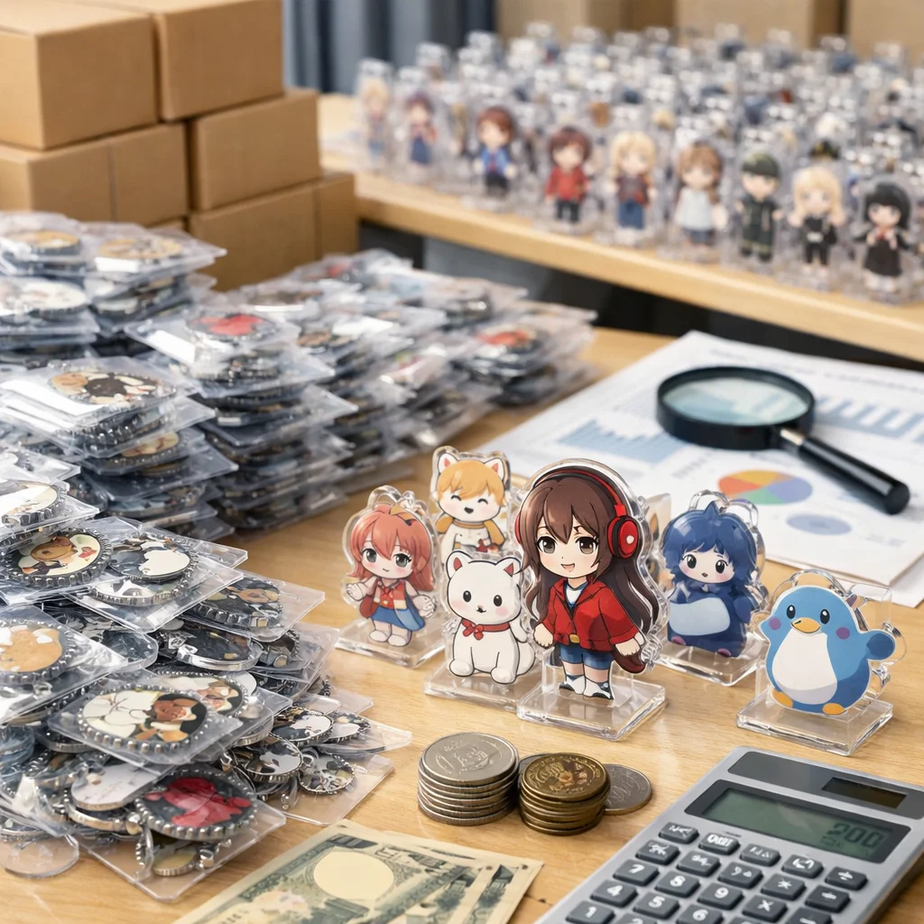 アクリルグッズの1000個発注時の価格は、品目によって異なり、主に材料量、加工工程、金具の種類が影響します。アクリルキーホルダー、アクリルスタンド、アクリルバッジ、アクリルブロックの相場を把握し、複数の業者から見積もりを取得することで、最適な選択が可能です。