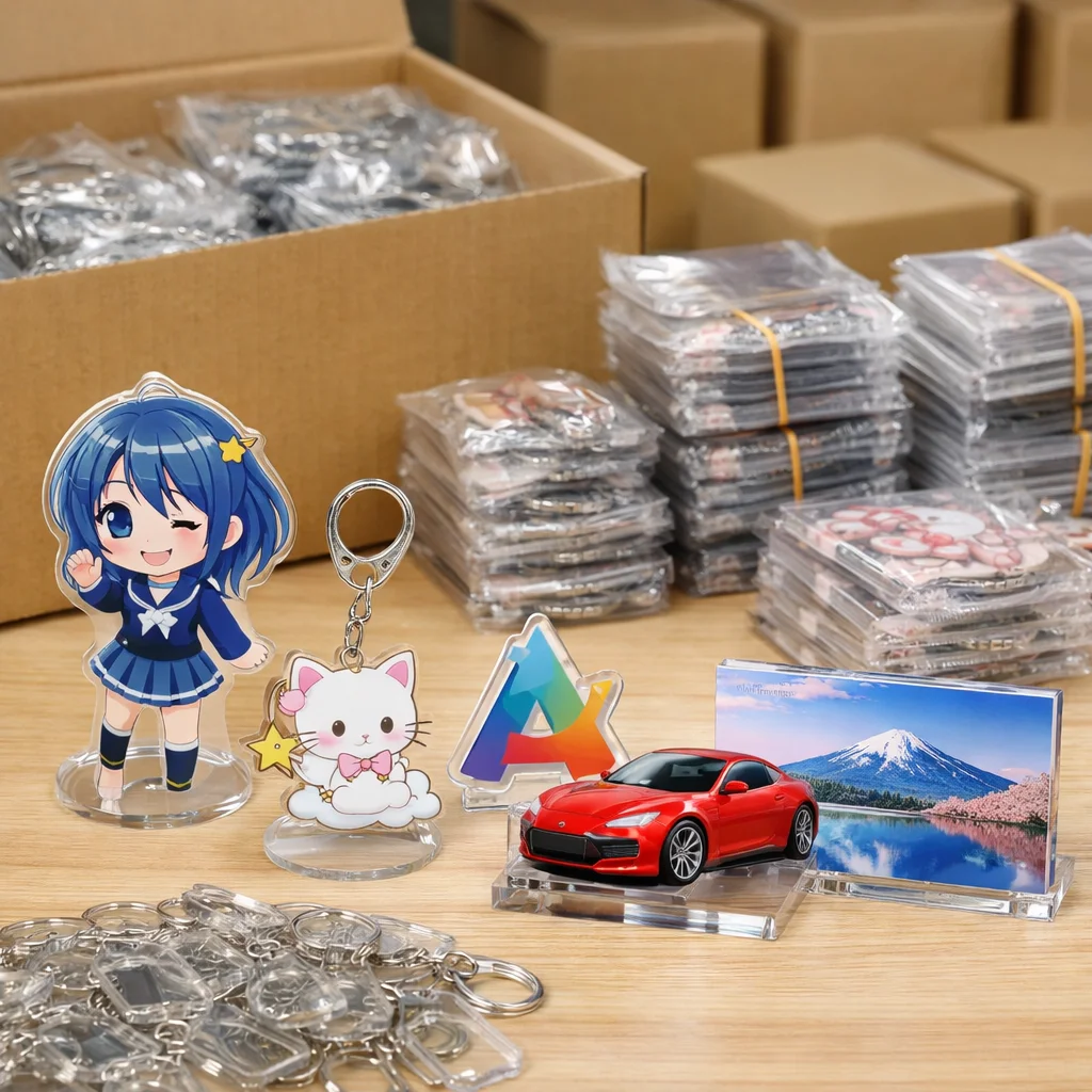 アクリルグッズは、その多様なデザインと用途から、個人や企業のプロモーション活動、イベントの記念品、コレクションアイテムとして幅広く利用されています。特に、アクキー(アクリルキーホルダー)、アクスタ(アクリルスタンド)、アクブロ(アクリルブロック)、アクリルバッジなどのアイテムは、人気が高く、多くの需要があります。